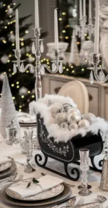 Set your Christmas dinner table with white porcelain plates, silver cutlery, and crystal glasses. Add frosted branches or metallic napkin rings for extra charm. The combination of light, reflection, and sparkle turns your home into a magical retreat.