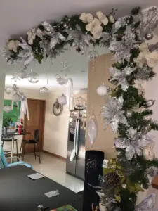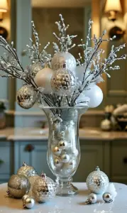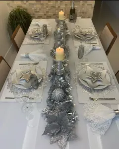 For a cozy contrast, pair silver with touches of gold, navy, or wood textures. A silver table centerpiece with glass candles, metallic garlands, and shimmering fabrics brings harmony and style to your dining room. Even small touches — silver bows on gifts, shiny baubles in jars, or glittery stars on windows — can elevate the whole atmosphere.
